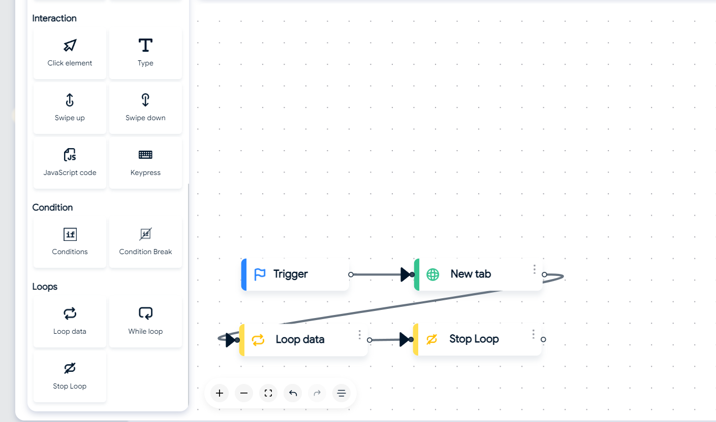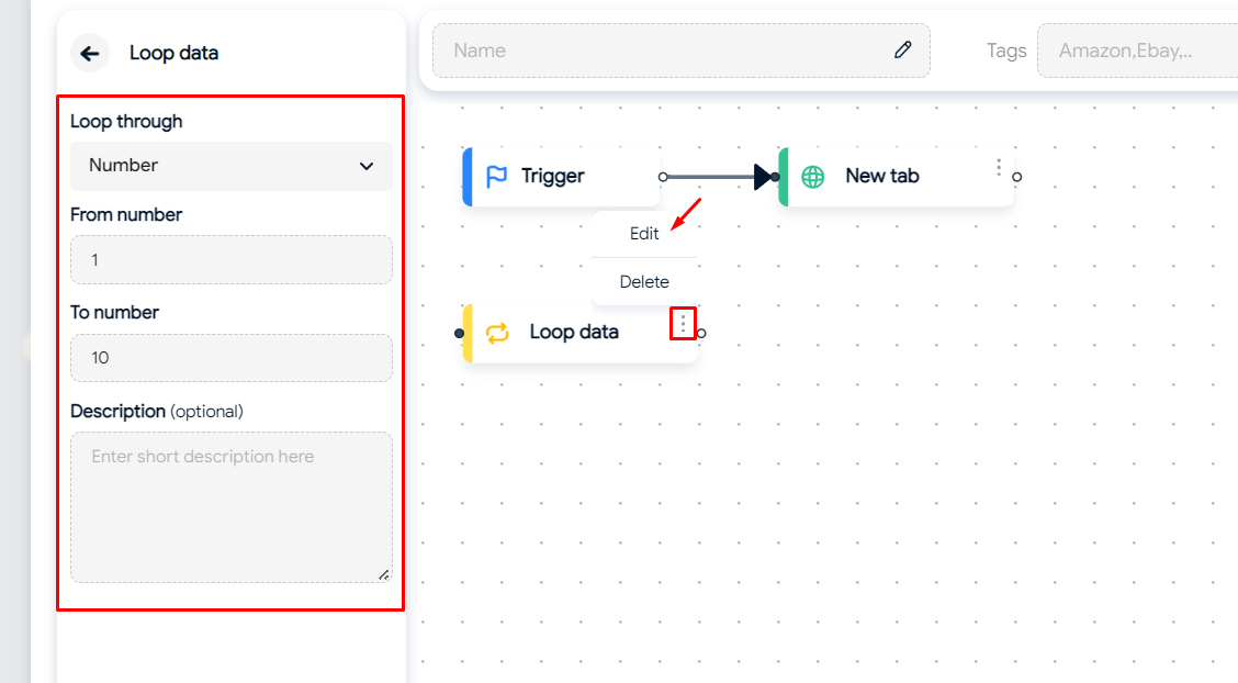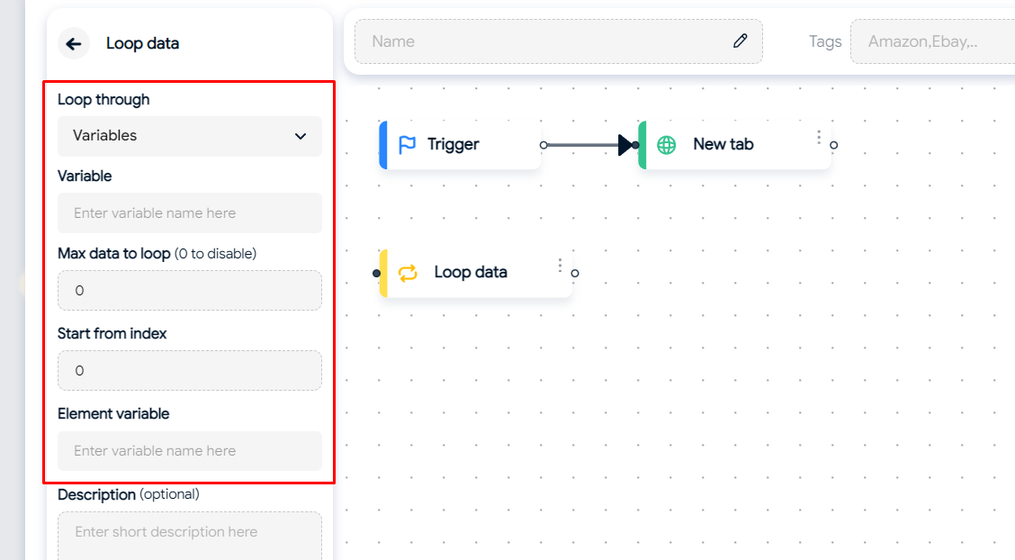 * *Max data to loop:* Maximum number of iterations. If you don't input or set it to 0, the loop won't execute.