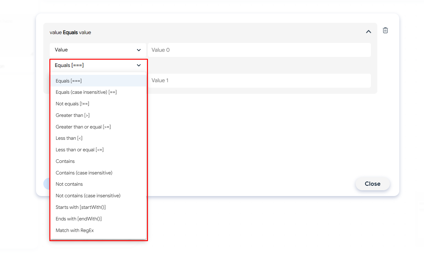 * ***Equals (case insensitive):*** Similar to the Equals operator, but it does not differentiate between uppercase and lowercase letters, typically used for strings. For example, "Hello" will be considered equal to "hello".