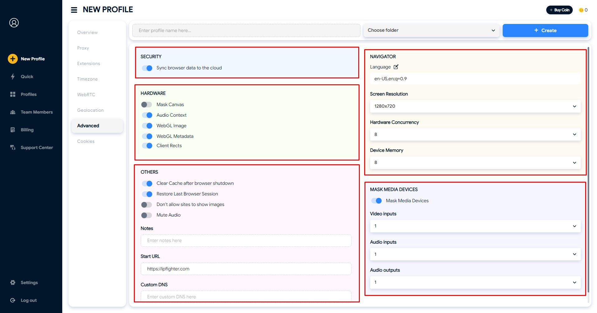These are the advanced settings available when creating a new profile on Hidemyacc.