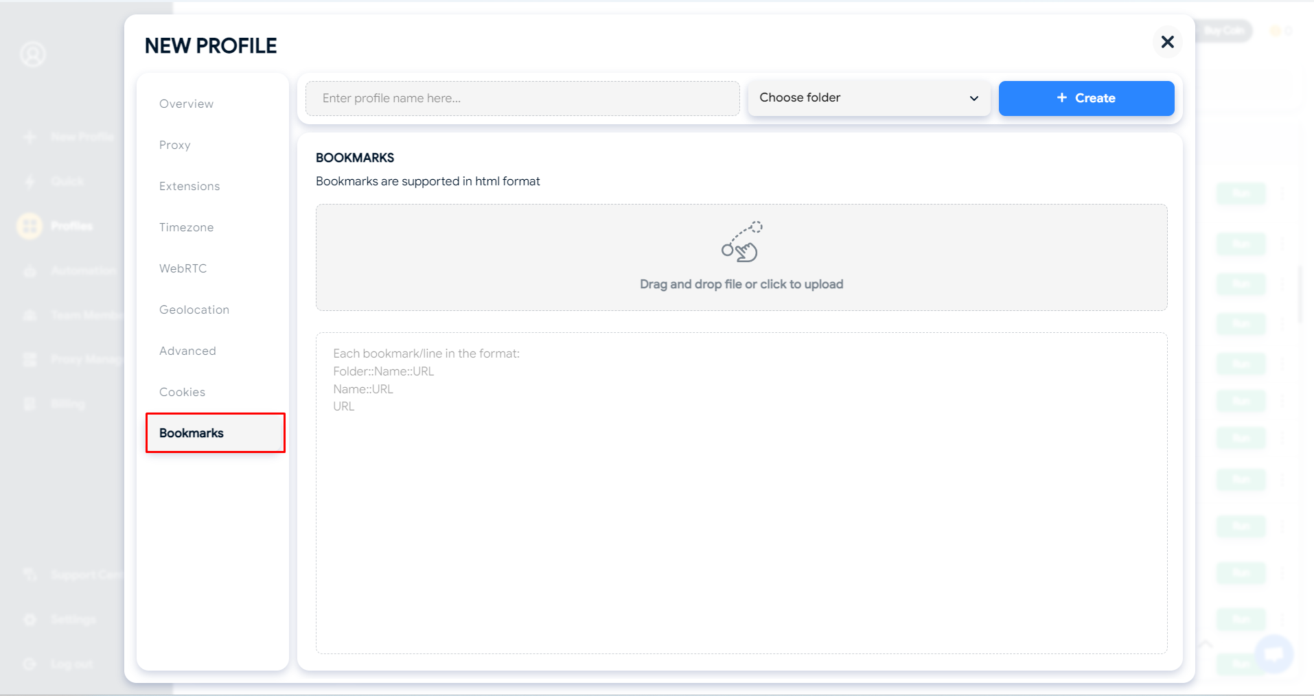 Bookmarks are supported in HTML format. You can upload bookmarks from your computer using the following formats: