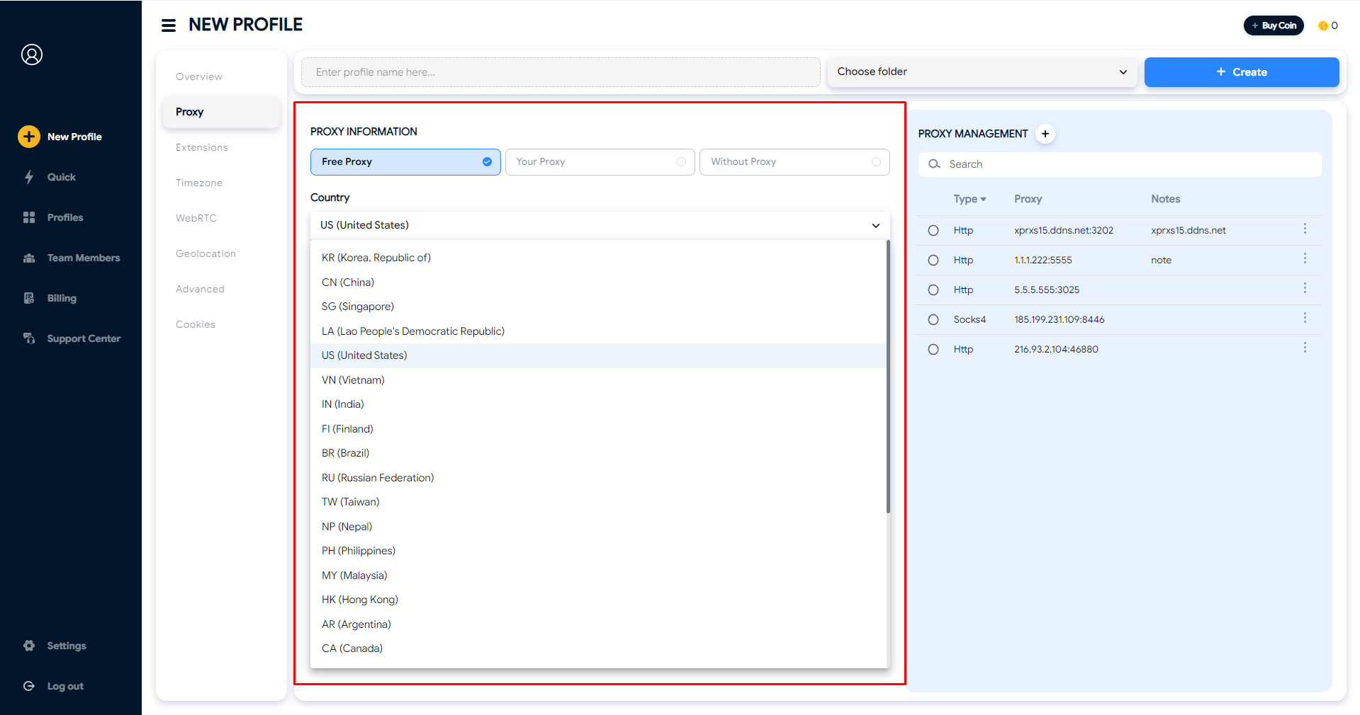 1. **`Free Proxy:`** From the Base package, you can access to about 10 000 free proxies from Hidemyacc. Choose the country then the system will randomly assign a proxy to your profile.