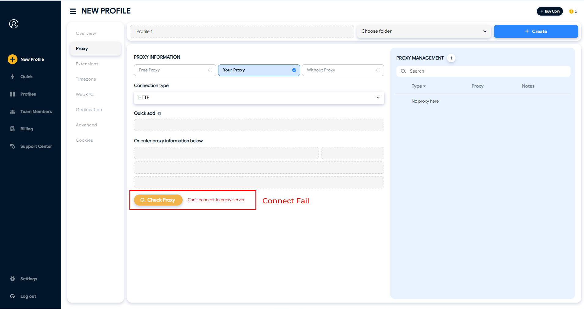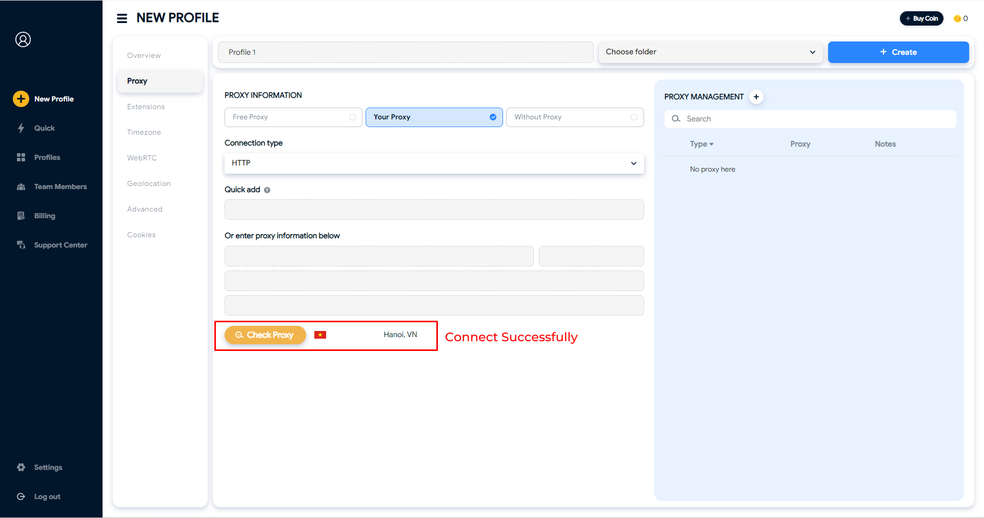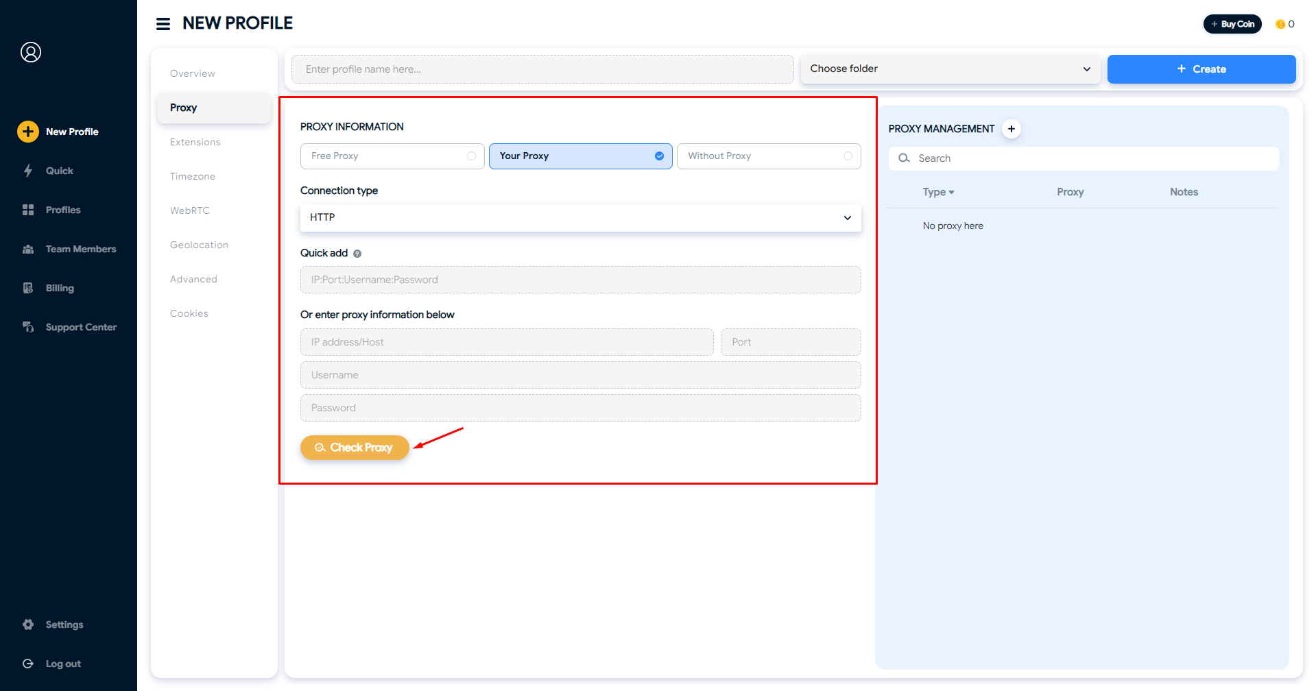 To set up a proxy for your profile, click on Proxy tab.&#x20;