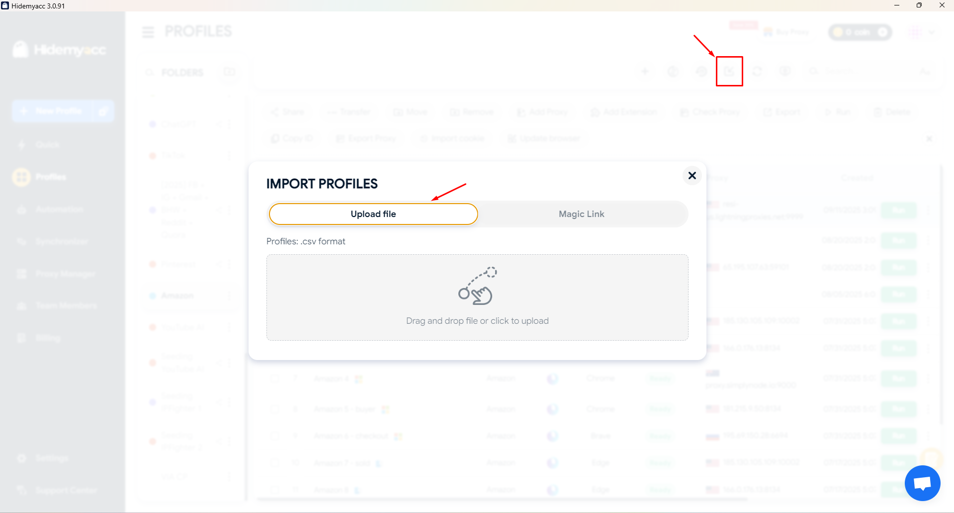 This feature allows you to import a previously exported Hidemyacc profile. After importing, the profiles will appear in your profile list and can be used immediately.