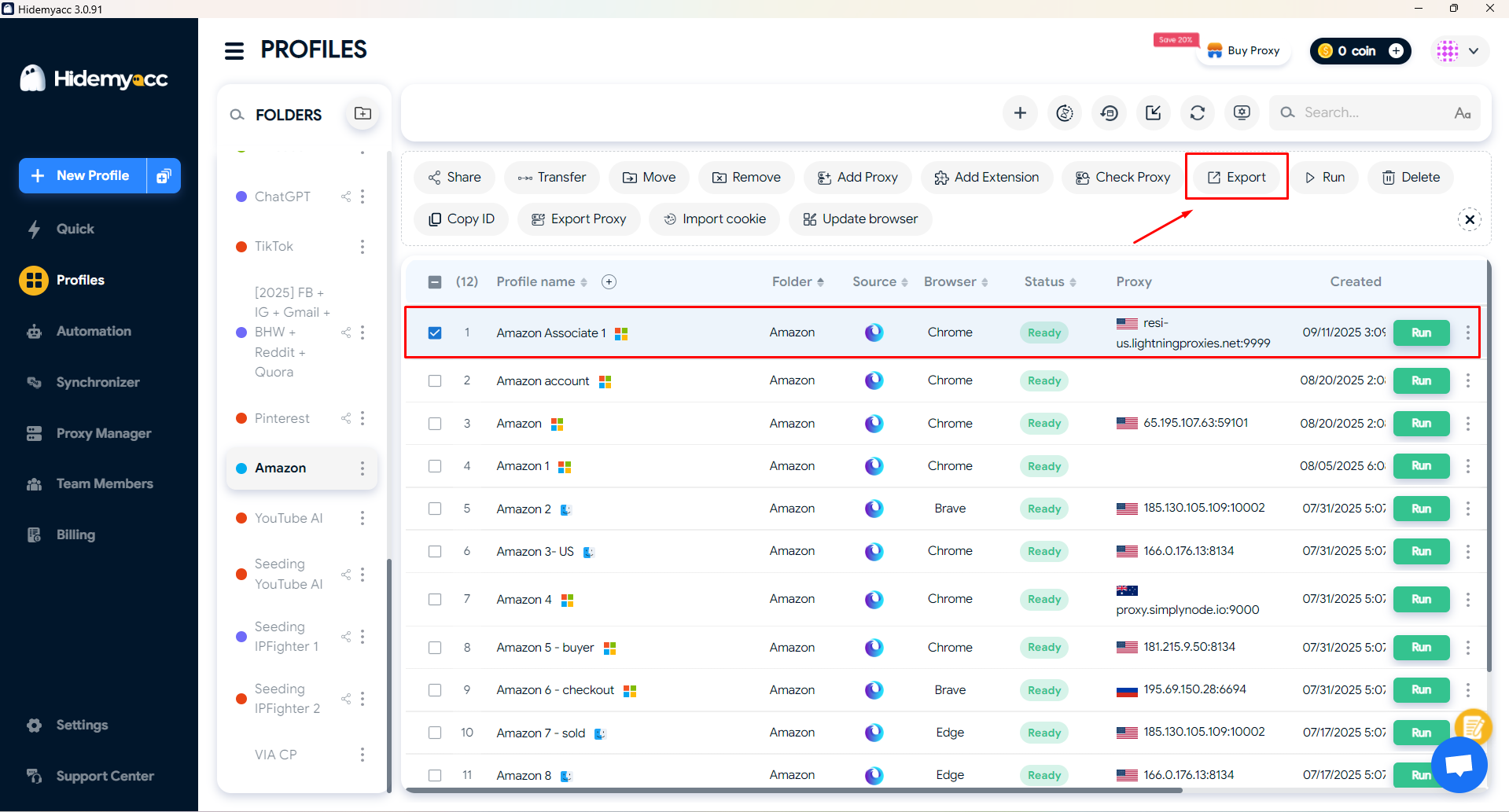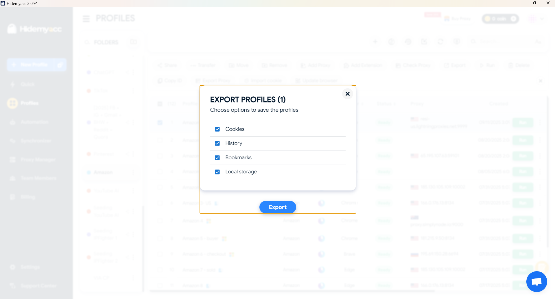 You can export any profile that is currently active, but you cannot export profiles that have been deleted or no longer exist in the system. The exported file can be imported back into Hidemyacc.