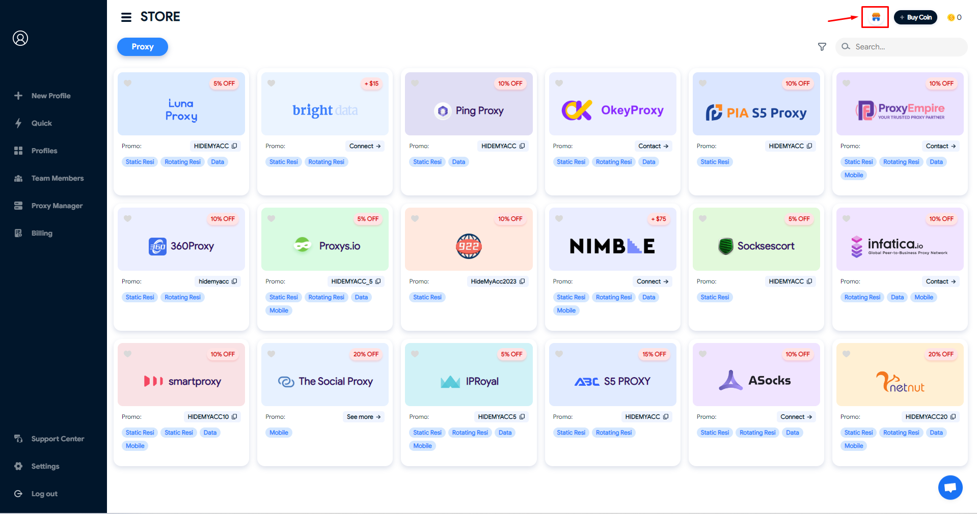 In the Proxy Store, Hidemyacc showcases trustworthy proxy providers in the market, along with promo codes for Hidemyacc users, offering discounts of up to 50%.